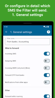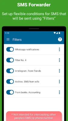 Ar šo lietotni jums ir iespēja definēt, kuri ziņojumi tiks pārsūtīti. Izvēlieties starp ienākošajām vai izejošajām īsziņām, vai abām. Tāpat varat konfigurēt paziņojumu pārsūtīšanu no visām lietotnēm vai tikai no konkrētām, lai saņemtu tikai jums patiešām svarīgo informāciju. Pārsūtīšana notiek uz daudzveidīgiem galamērķiem: uz citu tālruņa numuru (ņemiet vērā, ka mobilo sakaru operators var piemērot maksu), uz jūsu e-pasta adresi, izmantojot mūsu serveri, GMail API vai jebkuru SMTP serveri. Varat arī nosūtīt ziņas uz Telegram, ICQ un Vkontakte privātajām tērzētavām vai grupu čatiem, izmantojot mūsu vai savu botu. Attīstītāji ir pat iekļāvuši iespēju sūtīt datus uz jebkuru URL, sniedzot bezgalīgas iespējas integrācijai ar jūsu servera risinājumiem, turklāt MMS un WeChat funkcijas ir gaidāmas drīzumā.