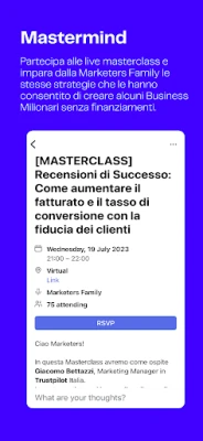 Šajā Marketers Pro platformā jūs atradīsiet gan iesācējus, kas sper pirmos soļus digitālajā pasaulē, gan pieredzējušus satura veidotājus un lielus uzņēmējus, veidojot dinamisku un atbalstošu kopienu. Tūlīt pēc pievienošanās jūs iegūsiet piekļuvi Marketers Pro mācību ceļam, kur varēsiet apgūt mārketinga pamatus, ko pasniedz Dario Vignali un Marketers Accelerator komanda. Mēs ar nepacietību gaidām jūs Marketers ģimenē!